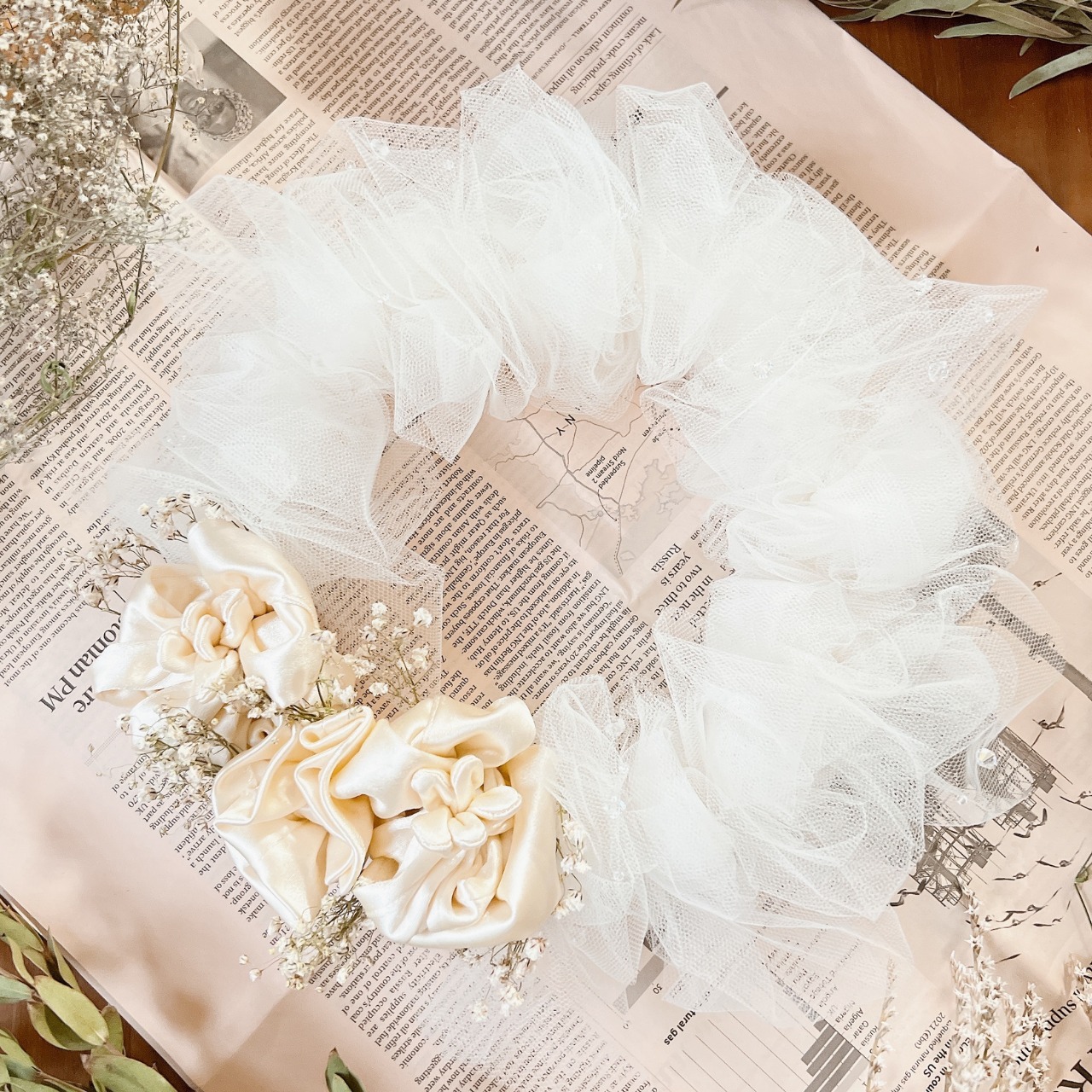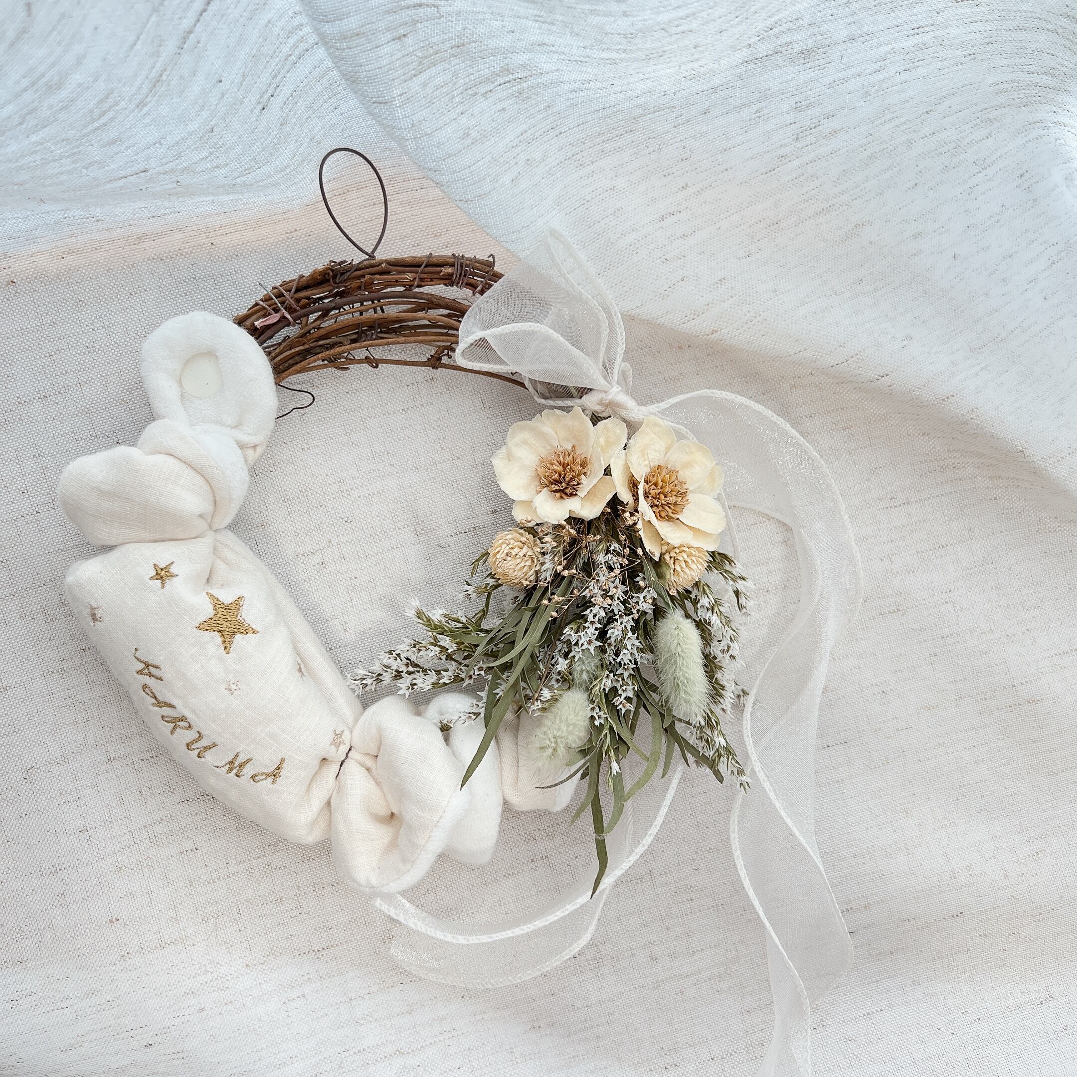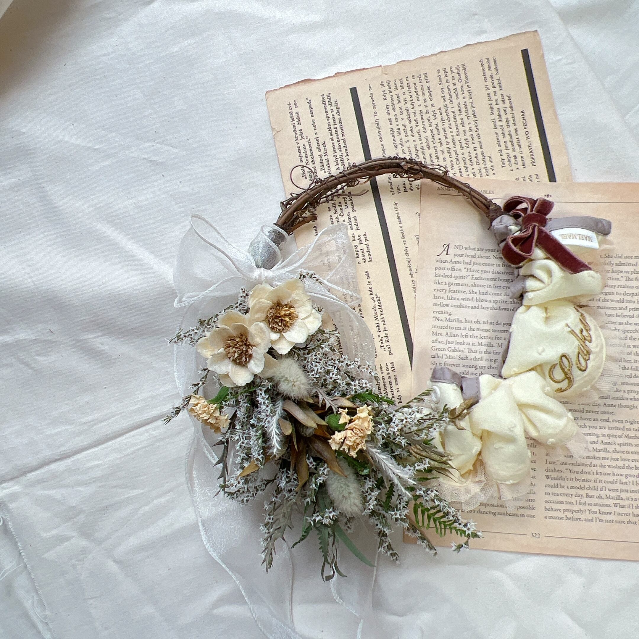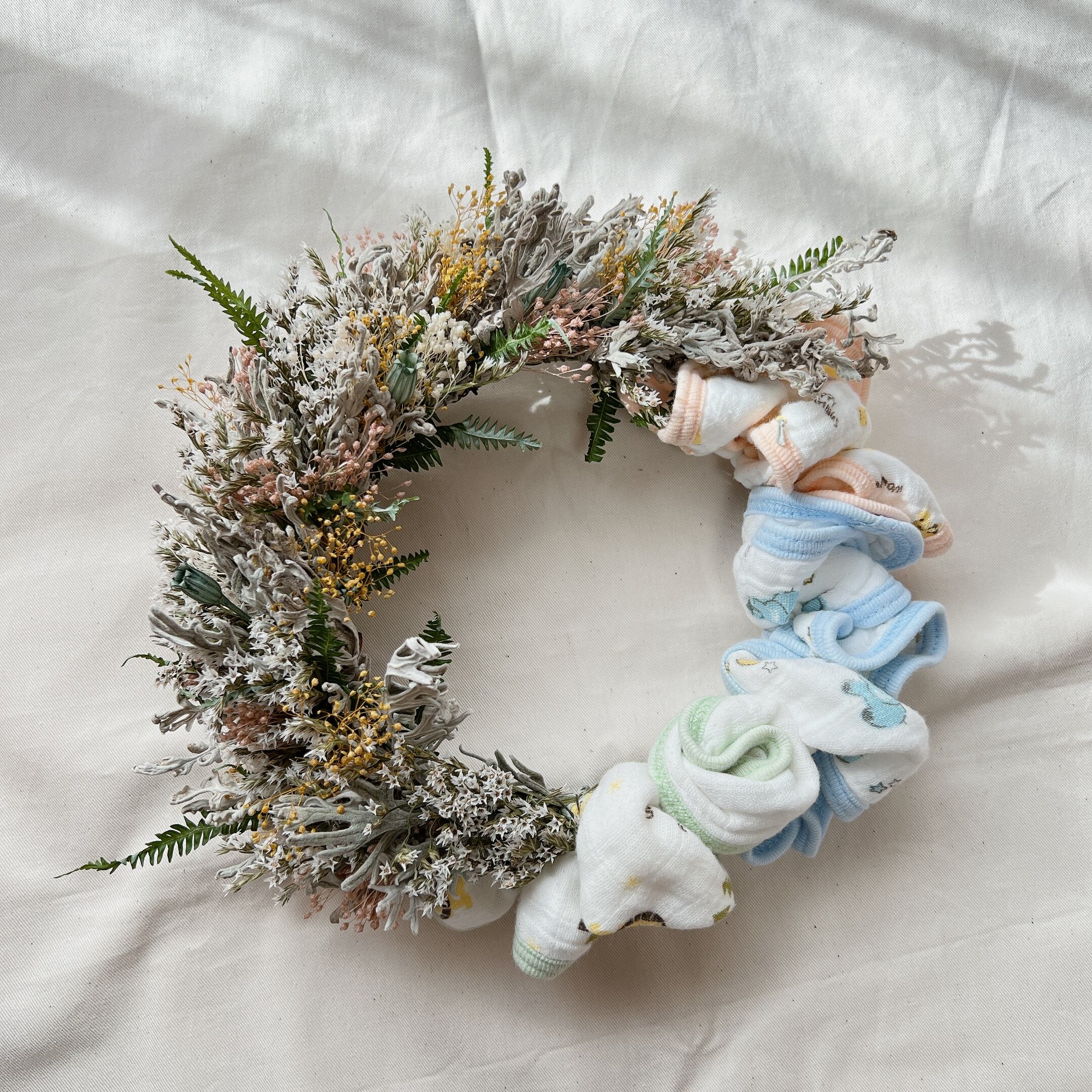 独自に考案したはぎれリースの制作技術を生かし、想い出の品をできるだけカットせずにフラワーモチーフやリースにアレンジします。カットしないことでその生地の質感や大きさなどの個性が際立ち世界に一つだけのリースに仕上がります。